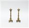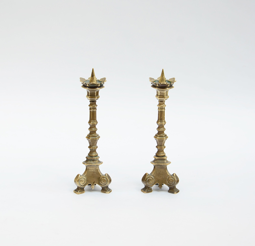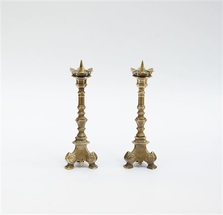 Coppia di piccoli porta ceri in bronzo con montanti esagonali e basi tripodi...
