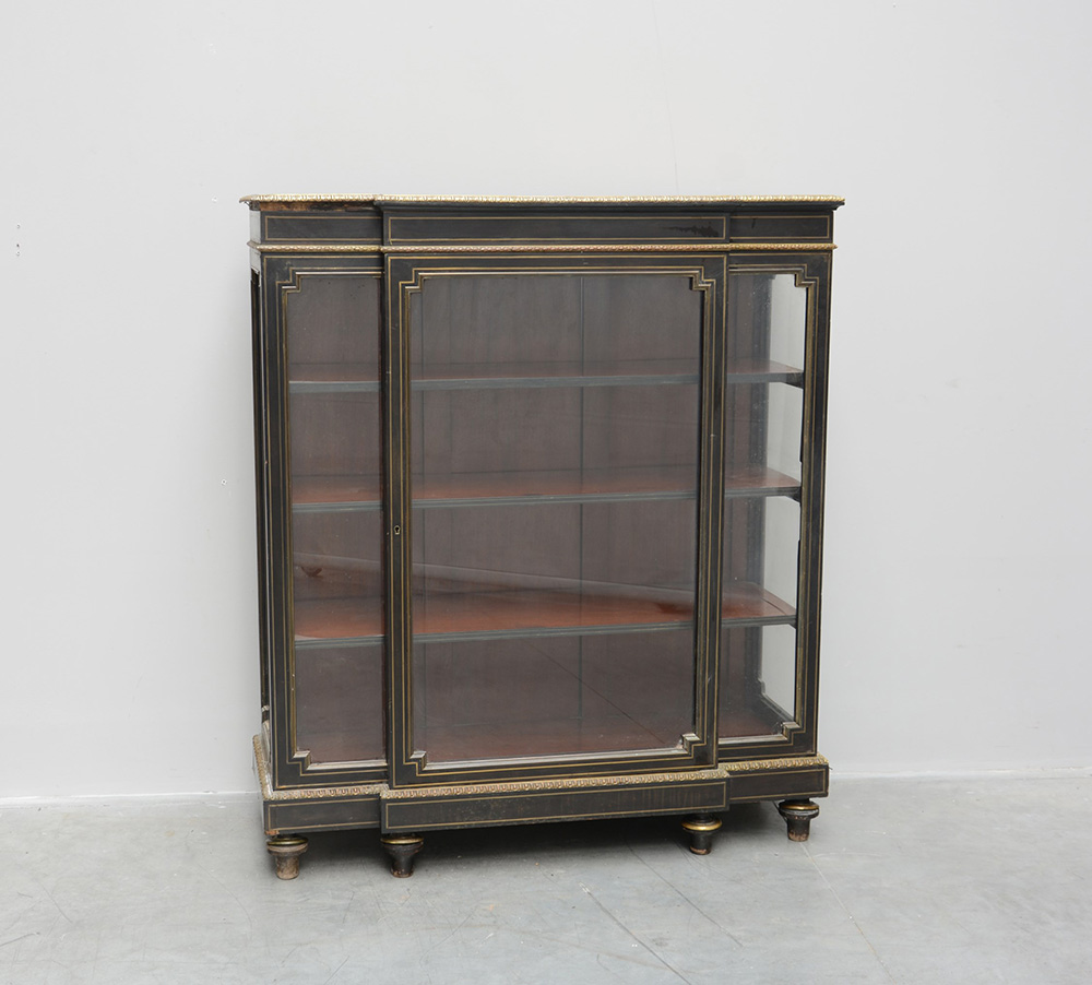 Vetrina in legno ebanizzato, filettata in ottone, con anta a vetri sul fronte. Piedi torniti, secolo XIX (cm 115x130x44) (difetti e mancanze)