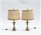 Coppia di lampade a due luci in bronzo tornito con paralumi plissettati (h cm 50) (difetti)