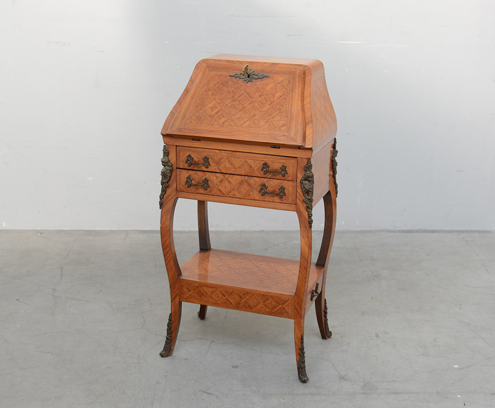 Piccola ribaltina lasronata a due cassetti ed antina ribaltabile celante vani. Gambe sagomate riunite da pianetto con cassettino laterale, maniglie e fregi in ottone (cm 50x95x33)