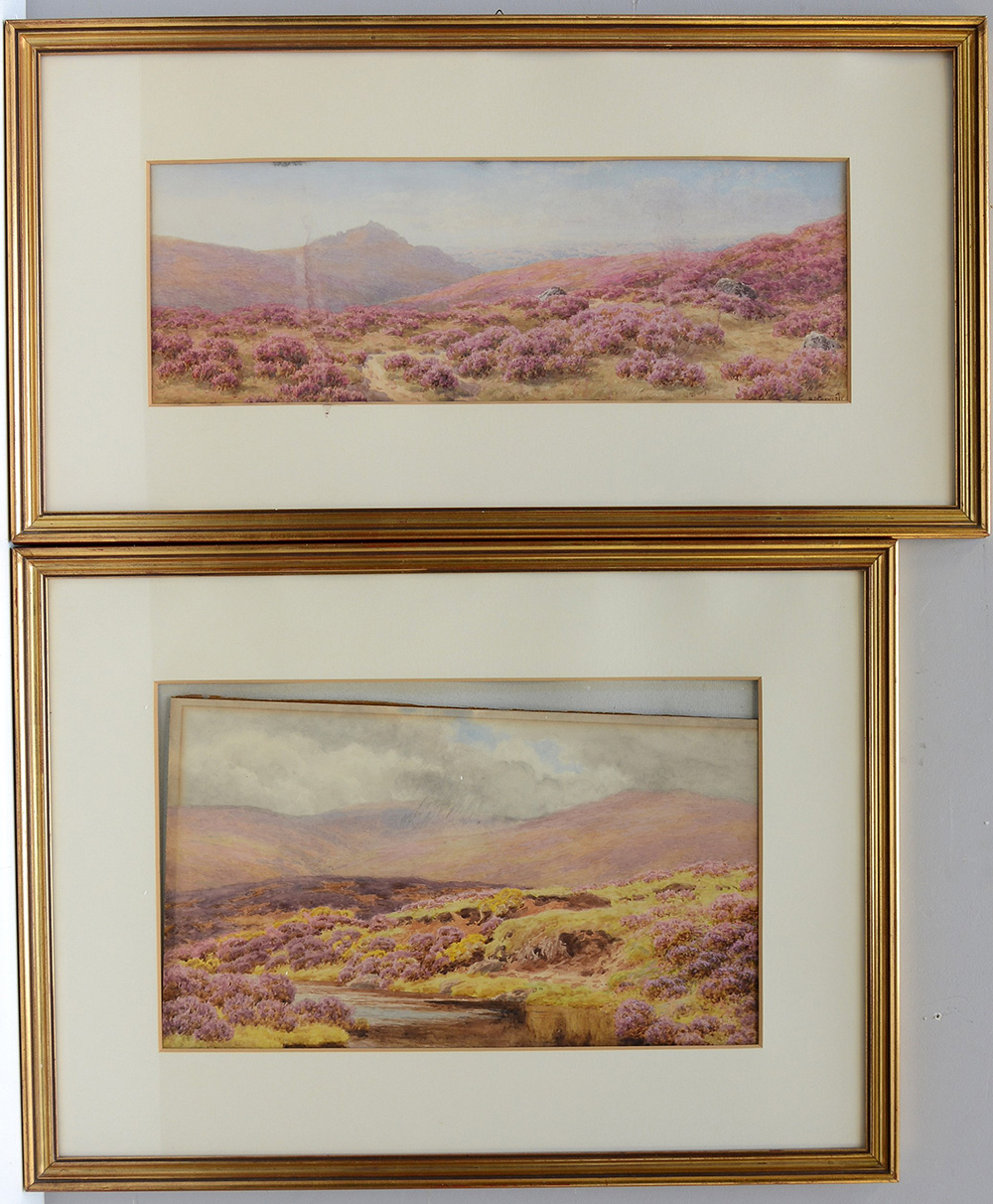 Lotto di due acquerelli raffiguranti paesaggi fioriti, misure differenti, in cornici (difetti)