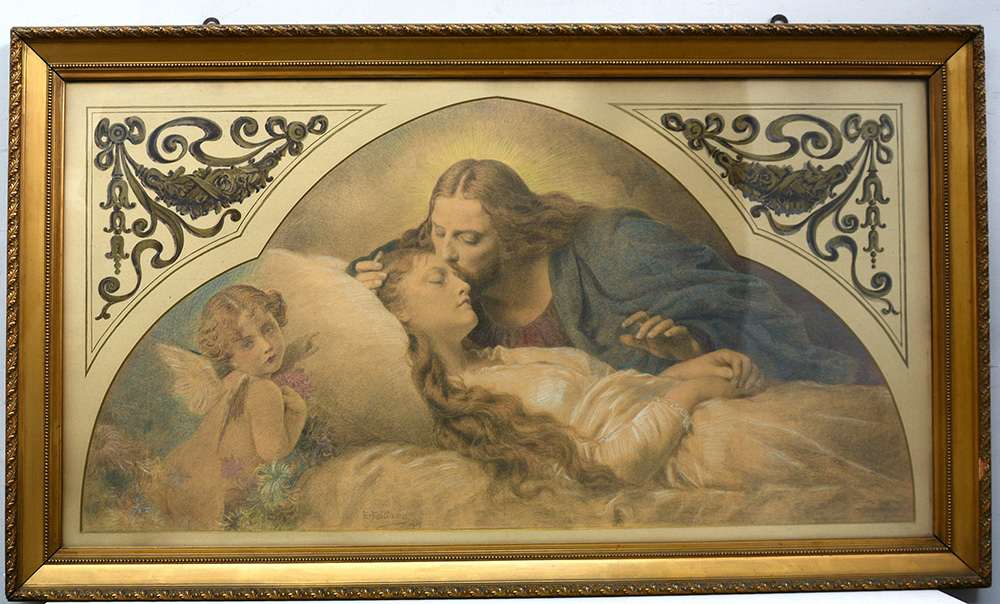 Fontana Ernesto (Cureglia, Canton Ticino 1837 - 1918) "Il bacio del riposo", tecnica mista su carta con passepartout sagomato e decorato (cm 75x140), firmato e datato 1909 in basso al centro. In cornice