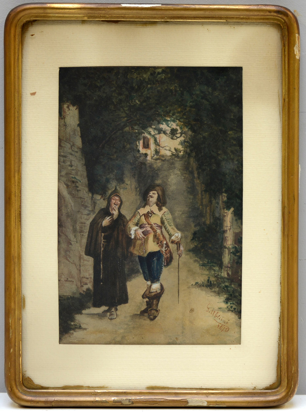 Scuola del secolo XIX, "Fra' Cristoforo e don Rodrigo", acquerello (cm 25x17) firmato e datato 1875 in basso a destra, in cornice (difetti)