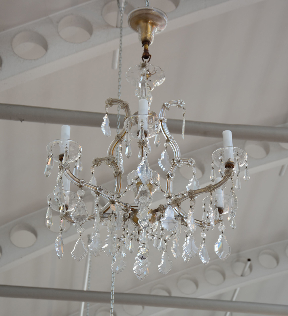 Lampadario a sette luci in stile Maria Teresa con pendagli in cristallo (d cm 75 circa h cm 100) (lievi difetti e mancanze)