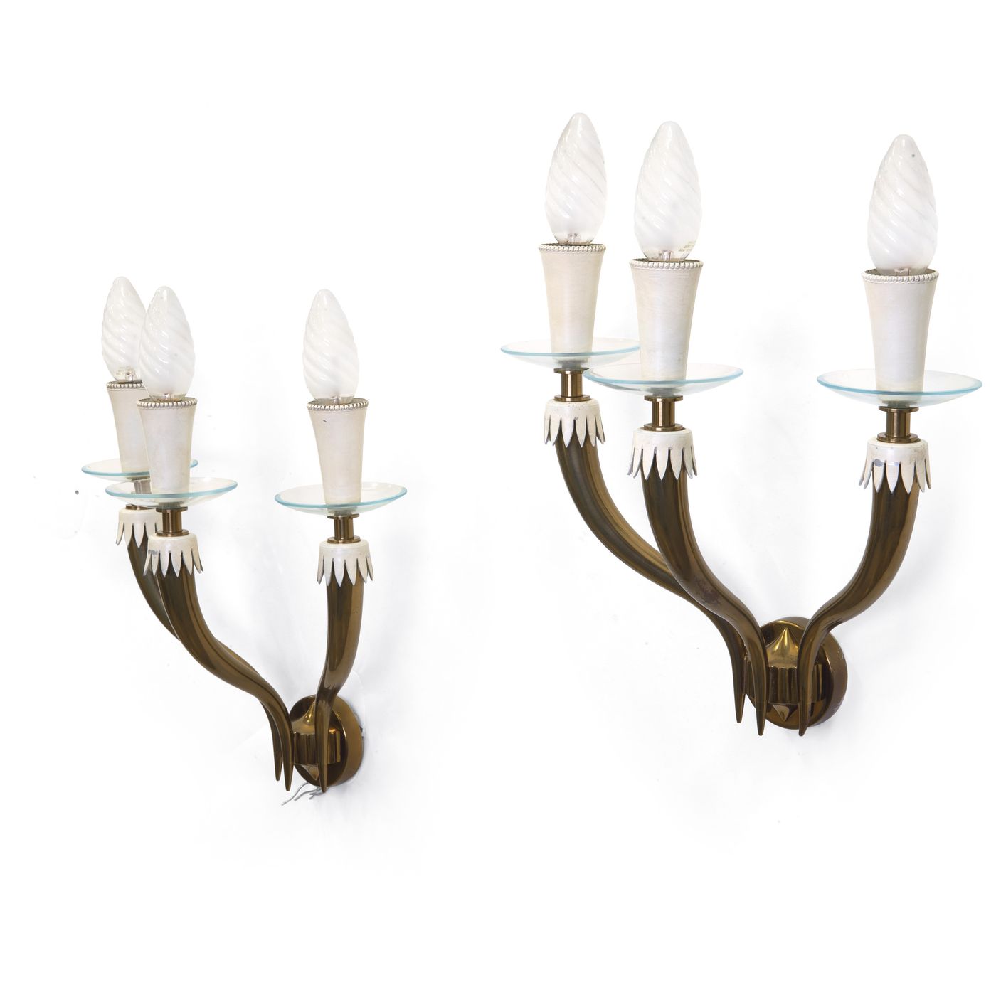 APPLIQUES - Coppia di appliques con struttura in forma di tripla cornucopia. Ottone zapponato, piattini in cristallo molato. 1945 circa. H cm 30
