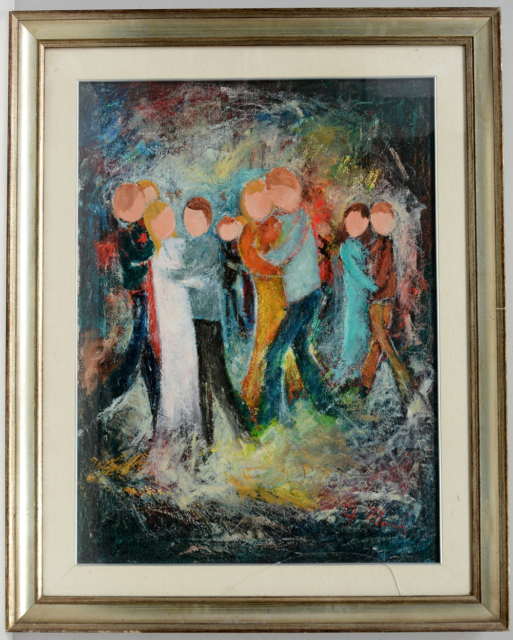Firma indecifrata, "La festa da ballo" 1973, olio su tela (cm 80x59) firmato in basso a destra, titolato, firmato e datato al retro. In cornice (difetti)