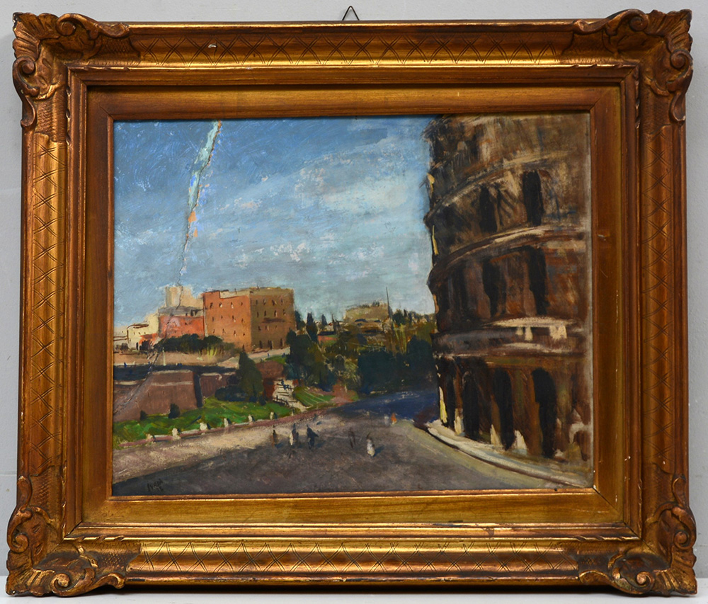 Firma indecifrata, "Scorcio di Roma con il Colosseo", olio magro su cartone pressato (cm 39,5x49,5) firmato e datato 1938 in basso a sinistra, in cornice (gravi difetti)