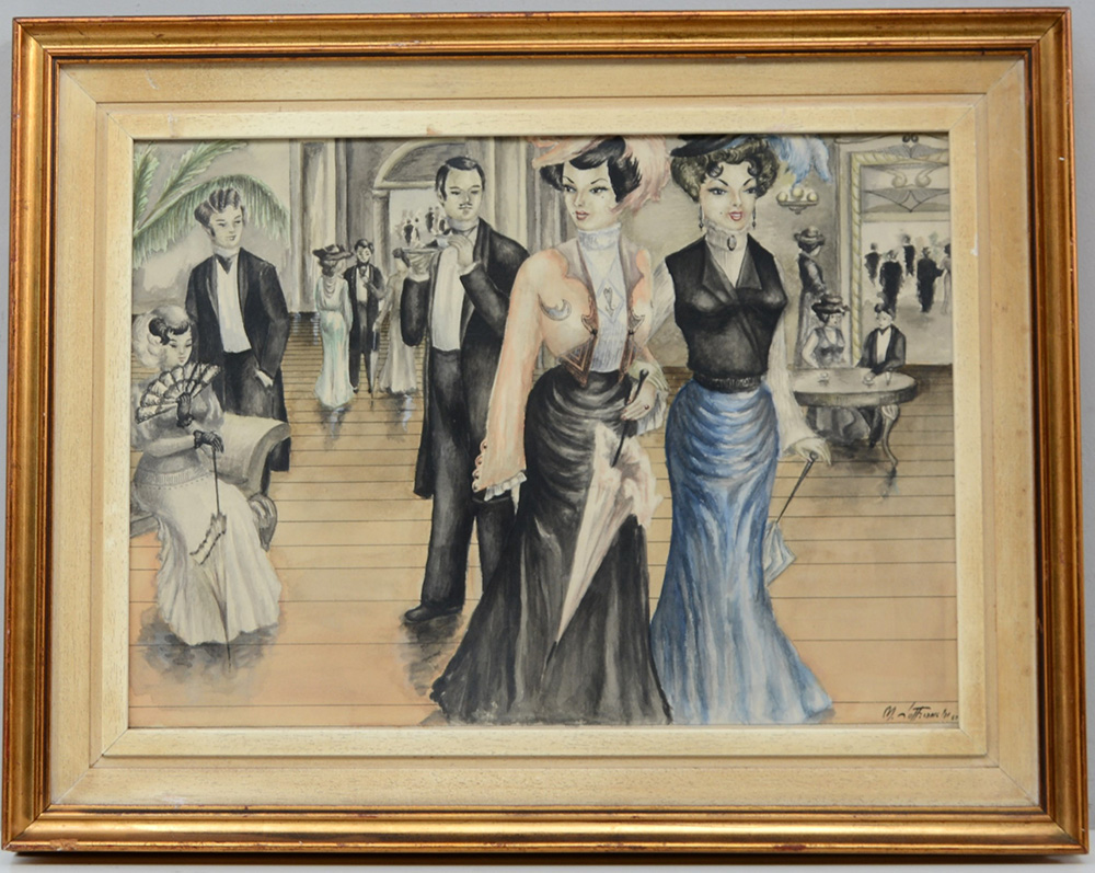 Firma indecifrata, "Il ricevimento", acquerelli e china su cartoncino (cm 39x53) firmato e datato 1953 in basso a destra, in cornice (lievi difetti)