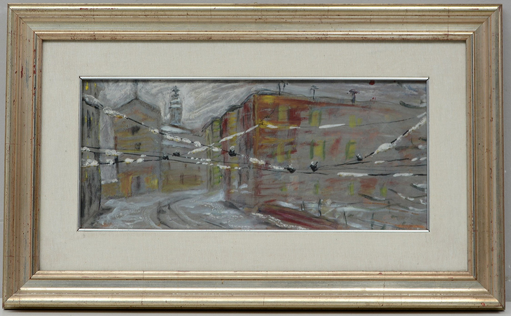 Ignoto, "Nevicata in citt‡", olio su cartone pressato (cm 20,5x47), in cornice
