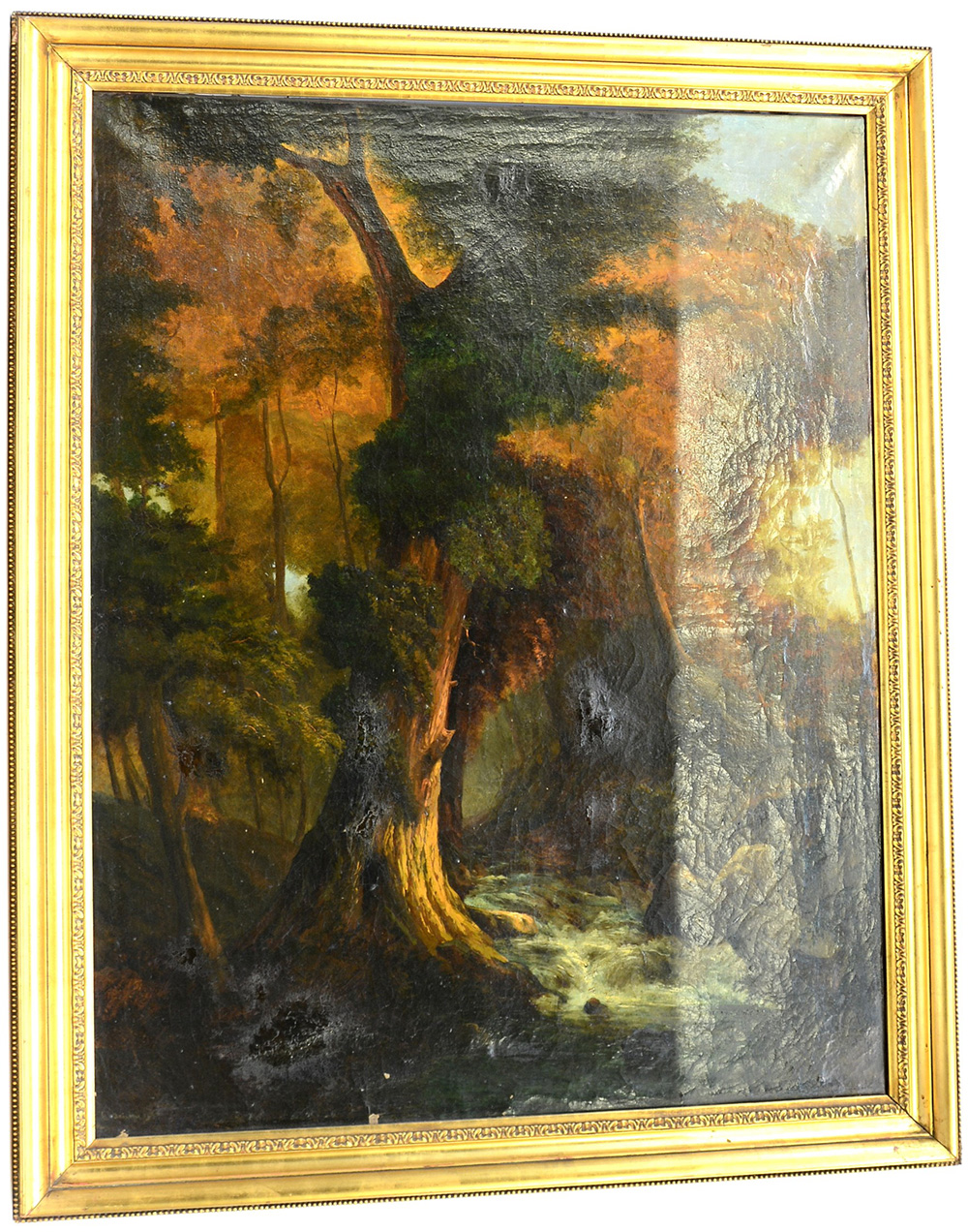 Lotto 2547 | Ignoto,"Paesaggio boschivo", olio su tela (cm 105x81) (difetti e restauri)