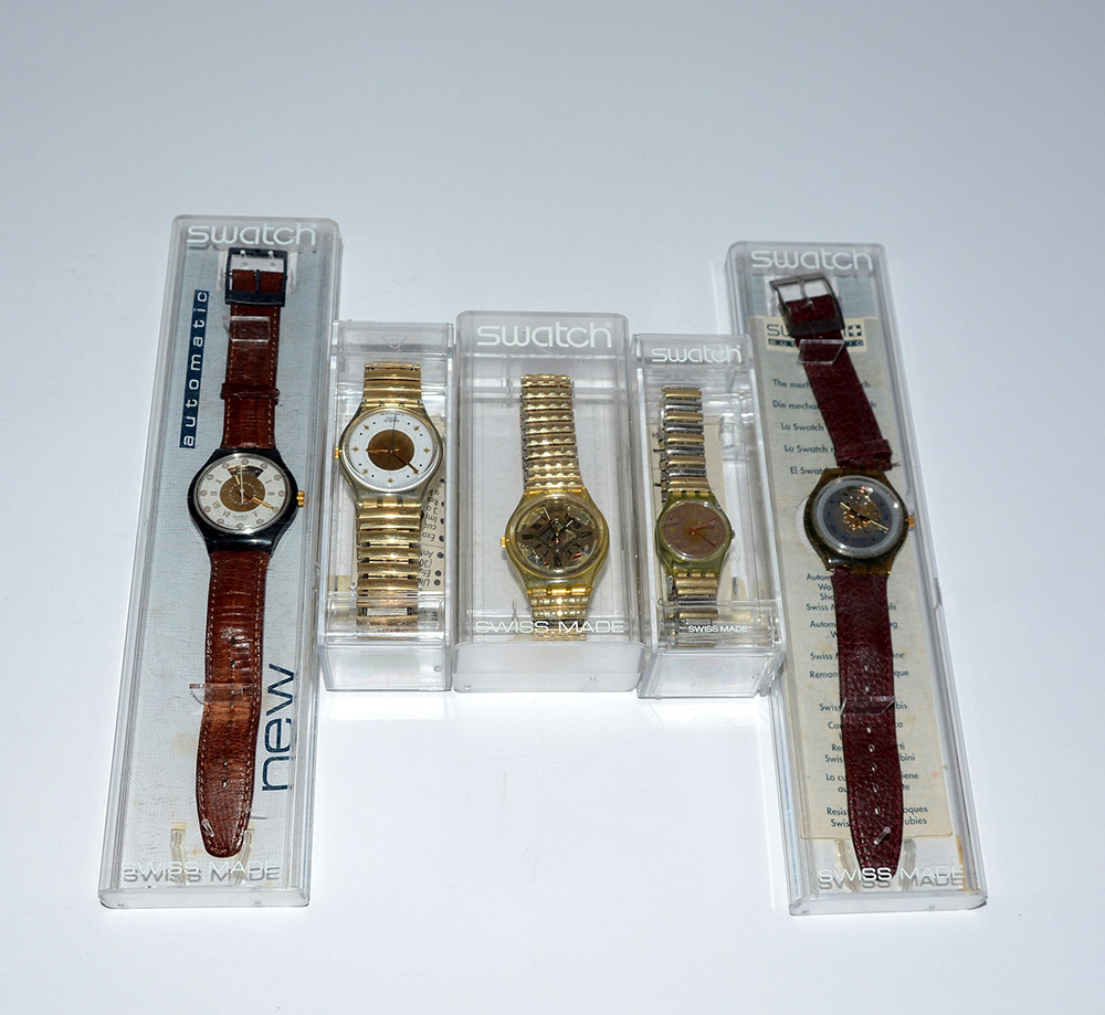 Lotto di cinque orologi da polso di marca Swatch: due automatici e tre al quarzo con cinturino elastico, in custodie (difetti)