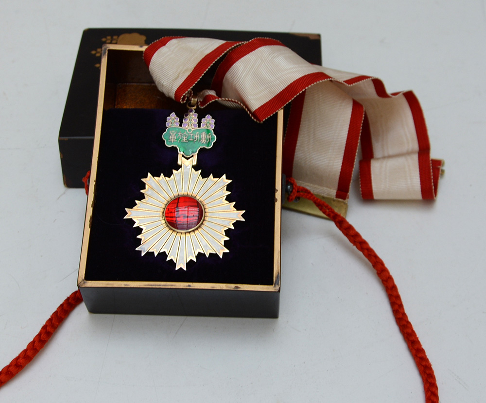 Arte orientale. Onoreficenza in smalti policromi contenuta in astuccio laccato