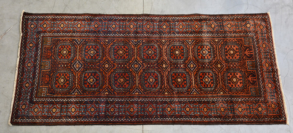 Tappeto Beluchistan, Persia sec. XX. Disegno a gul su fondo ruggine. Figure antropomorfe. Bordura cufica (cm 215x100)(difetti)