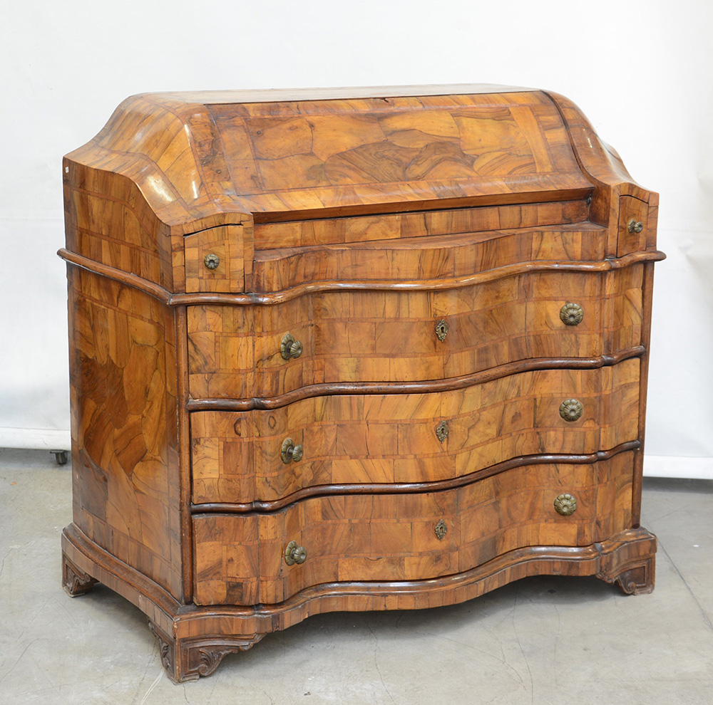 Ribalta "veronese" lastronato in radica di noce a tre cassetti sagomati sul fronte e anta ribaltabile celante cassettini e antina, montanti mossi a due cassetti. Piedi sagomati e intagliati (cm 102x101x60)