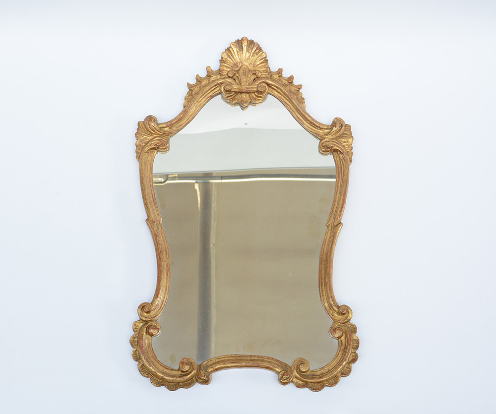 Specchierina di forma sagomata in legno dorato, intagliata a motivi vegetali e conchiglia stilizzata (cm 73x45)