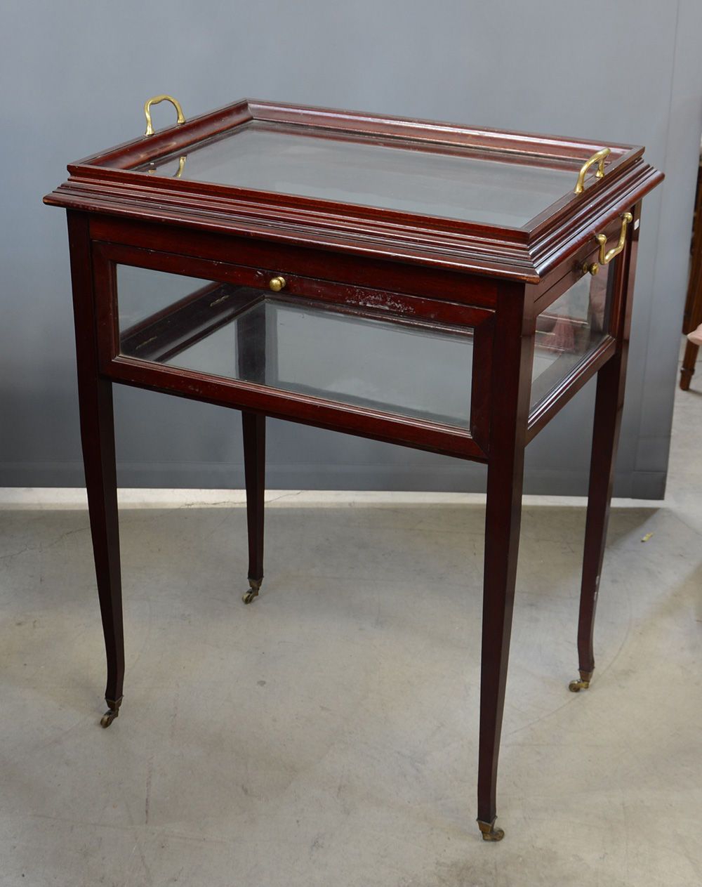 Tavolino vetrina con piano a vossoio biansato, gambe sagomate terminanti con rotelle (cm 63x83x48)