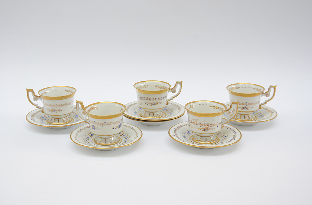 Manifattura tedesca. Gruppo di cinque tazze con sei piattini in porcellana decorata in policromia e oro a motivi vegetali (difetti)
