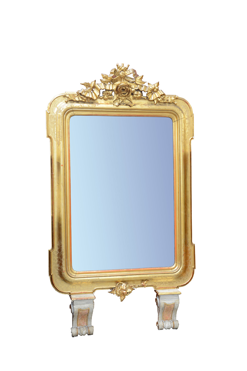 Specchiera rettangolare in legno dorato e bulinato con fregi riccamente intagliati a foglie, volute e nastro. Sec. XIX (cm 200x130). Unita a due basi in legno di forma sagomata in legno laccato e dorato (difetti e mancanze)