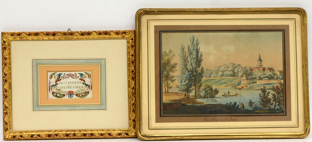 Lotto composto da una stampa a colori raffiguranti paesaggio lacustre e un acquerello raffigurante angeli, in cornici