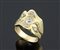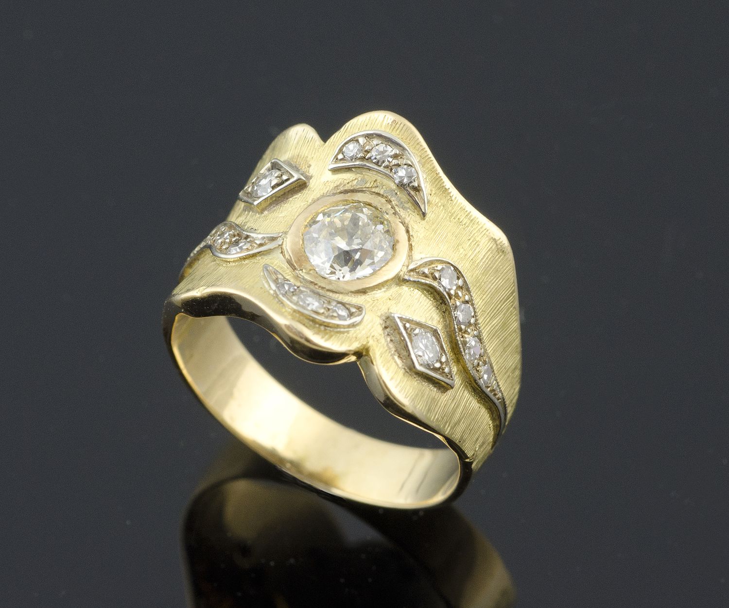Anello in oro giallo satinato a fascia con al centro diamante taglio vecchia Europa per ct 0,65 , diamanti taglio huit huit sui decori ondulati per ct 0,30