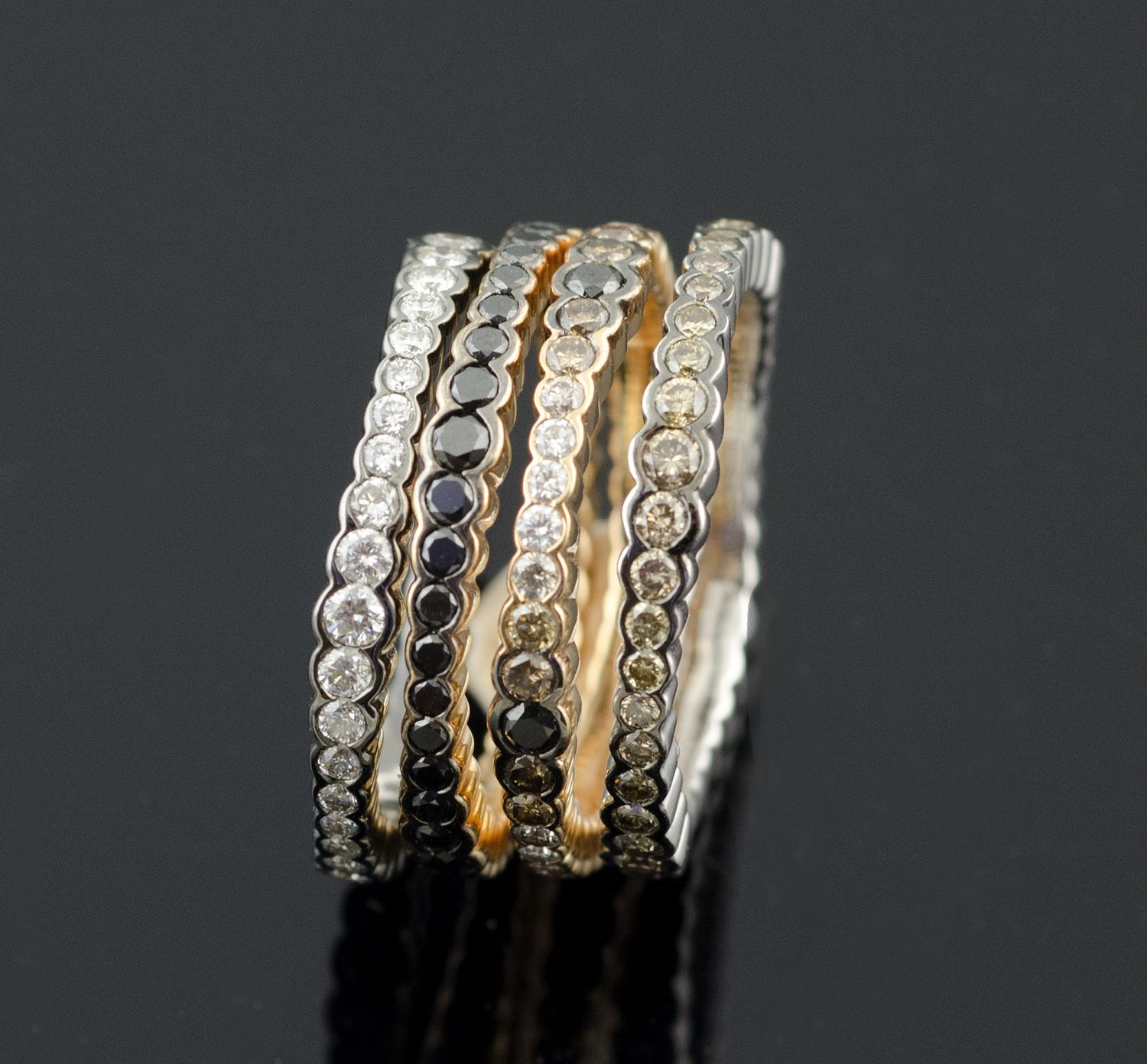 Quatrro fedine Eternity, una in oro bianco brunito con diamanti taglio brillante per 0,70, una oro rosè con diamanti neri per ct 0,80, una in oro rosè con diamanti taglio brillante per per 0,15, diamanti neri ct 0,50 e diamanti brown per ct 015, e una fe