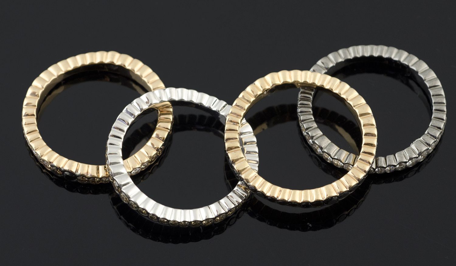 Quatrro fedine Eternity, una in oro bianco brunito con diamanti taglio...