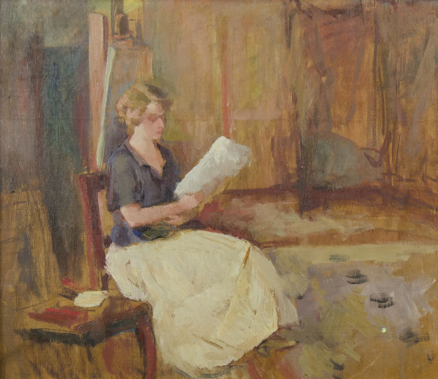 Enrico Fonda Fiume 1892-Parigi 1929 "Ragazza in lettura" cm. 37x43 - olio su compensato Al retro timbro Atelier Enrico Fonda.