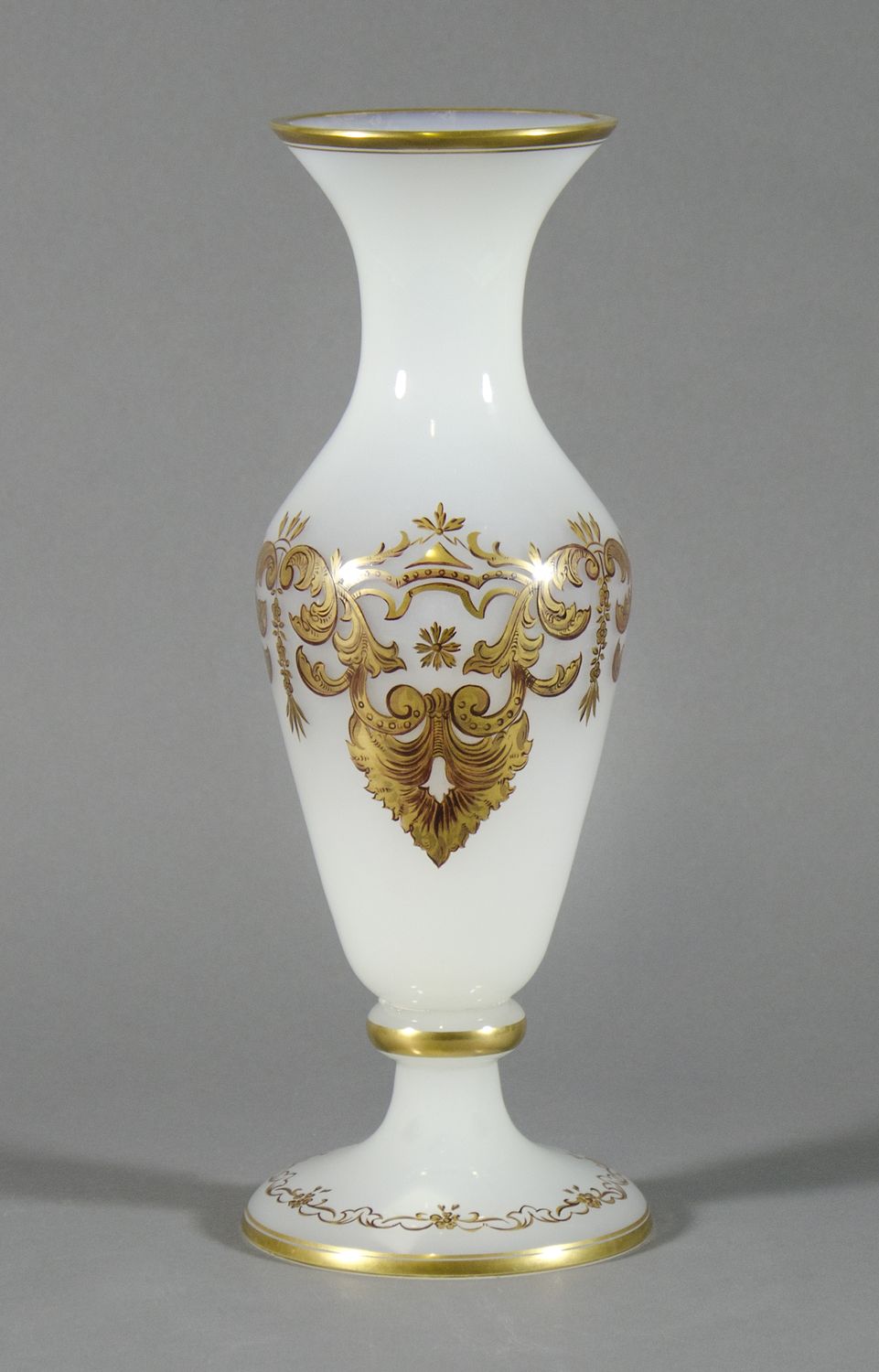 Lotto 57 | Vaso in vetro opalino con decori e bordi dorati. H. cm. 36,5.