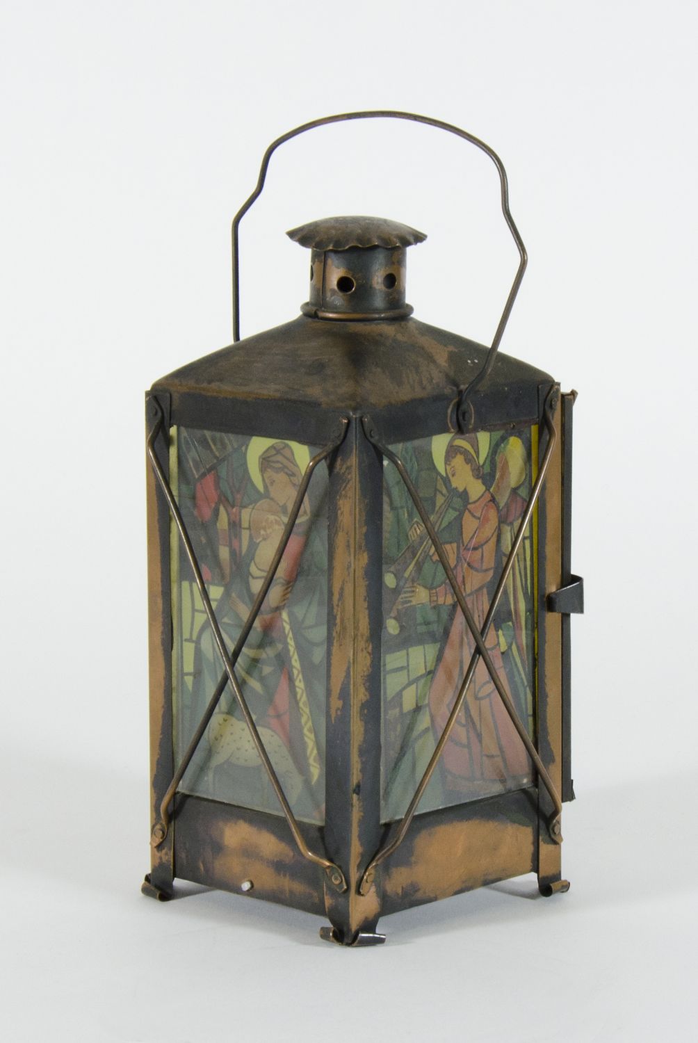 Lotto 58 | Lanterna in rame decorata con vetri policromi con figure, nella parte...