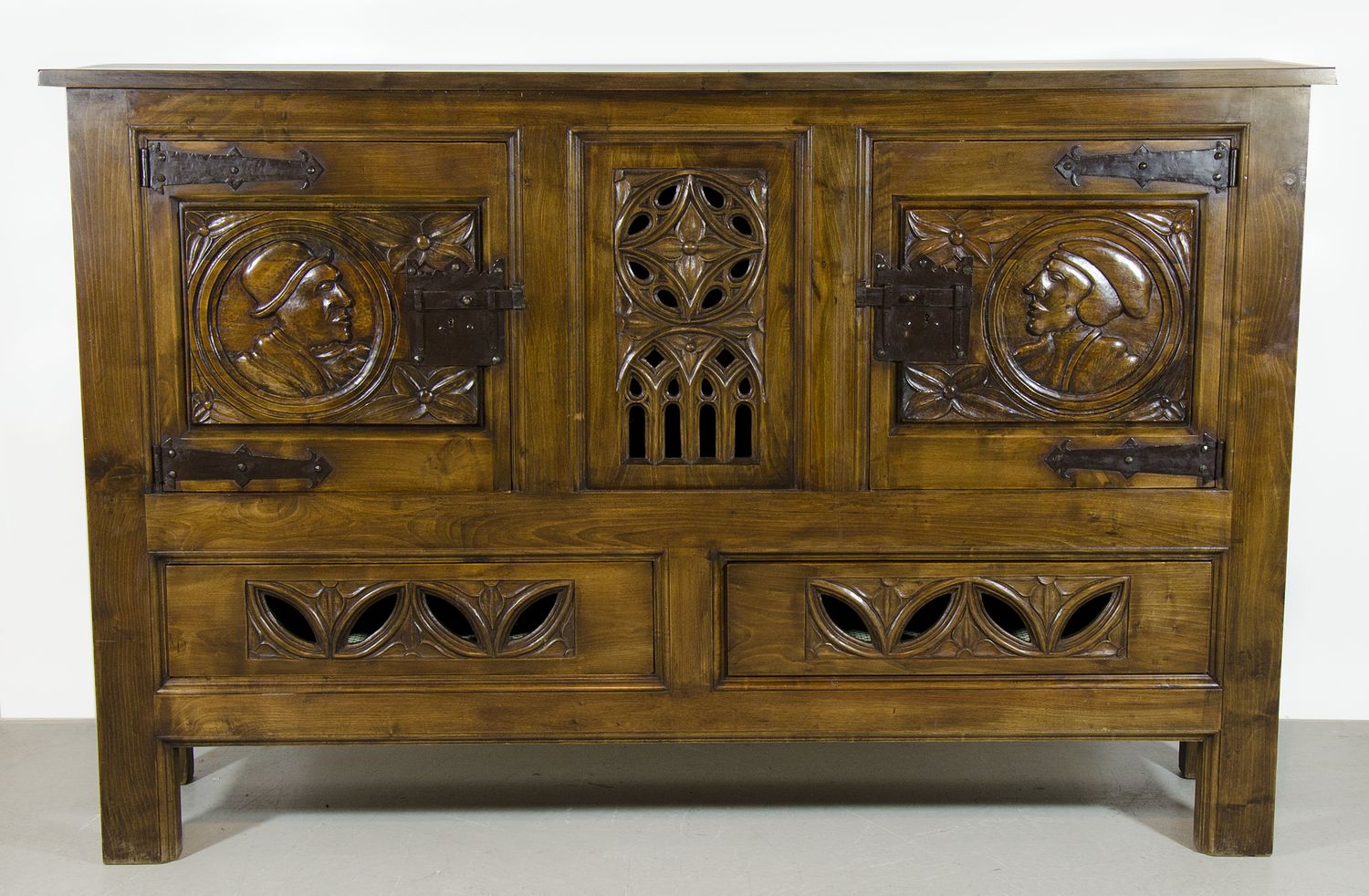 Grande credenza in legno a 2 ante e 2 cassetti, ante scolpite con volto di uomo di profilo, cassetti scolpiti e traforati. cm. 131x203x48.