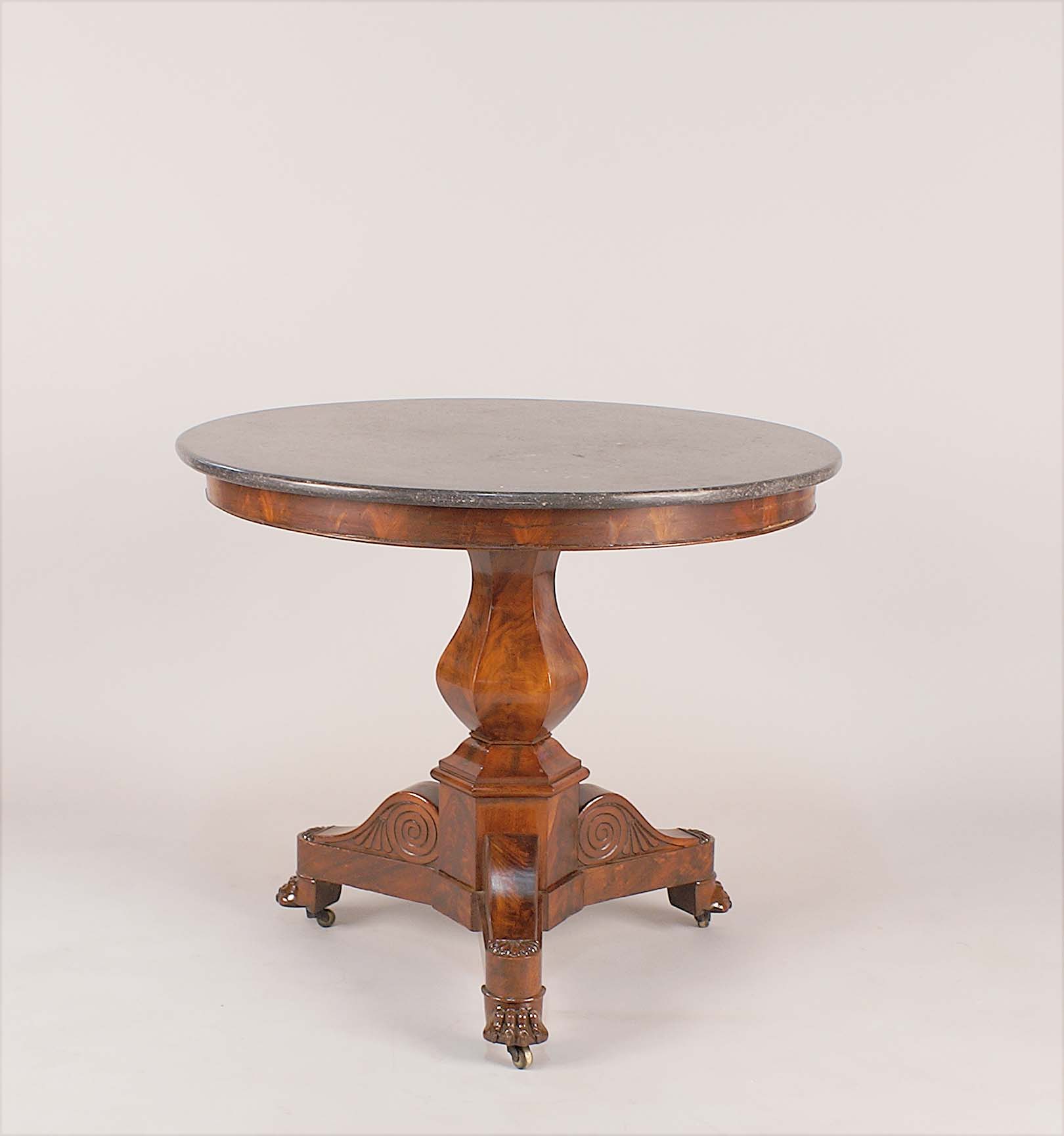 Tavolo da centro in piuma di mogano, piano circolare in marmo fossile, poggiante su base a balaustro con terminali a tripode, Francia, fine del XIX secolo, h. cm. 73, d. cm. 85.