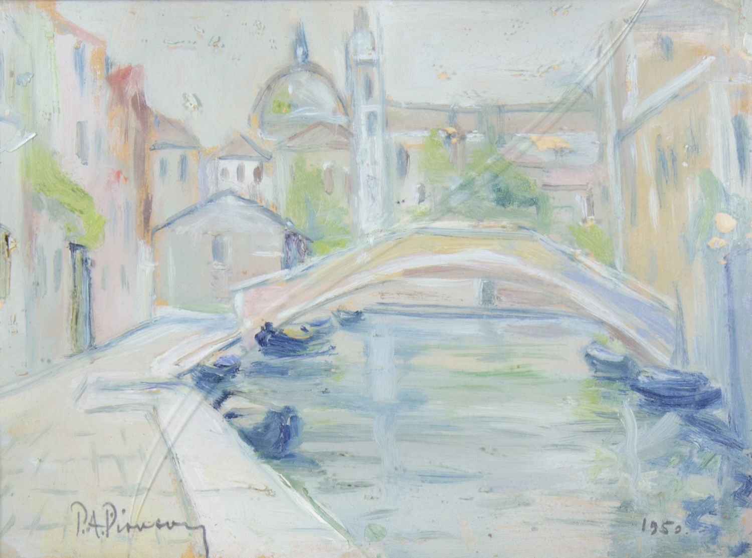Pompeo Piovesan Meduna di Livenza 1908 "Canale a Venezia" cm. 24x34 - olio su cartone Firmato b. a s. e datato 1950.