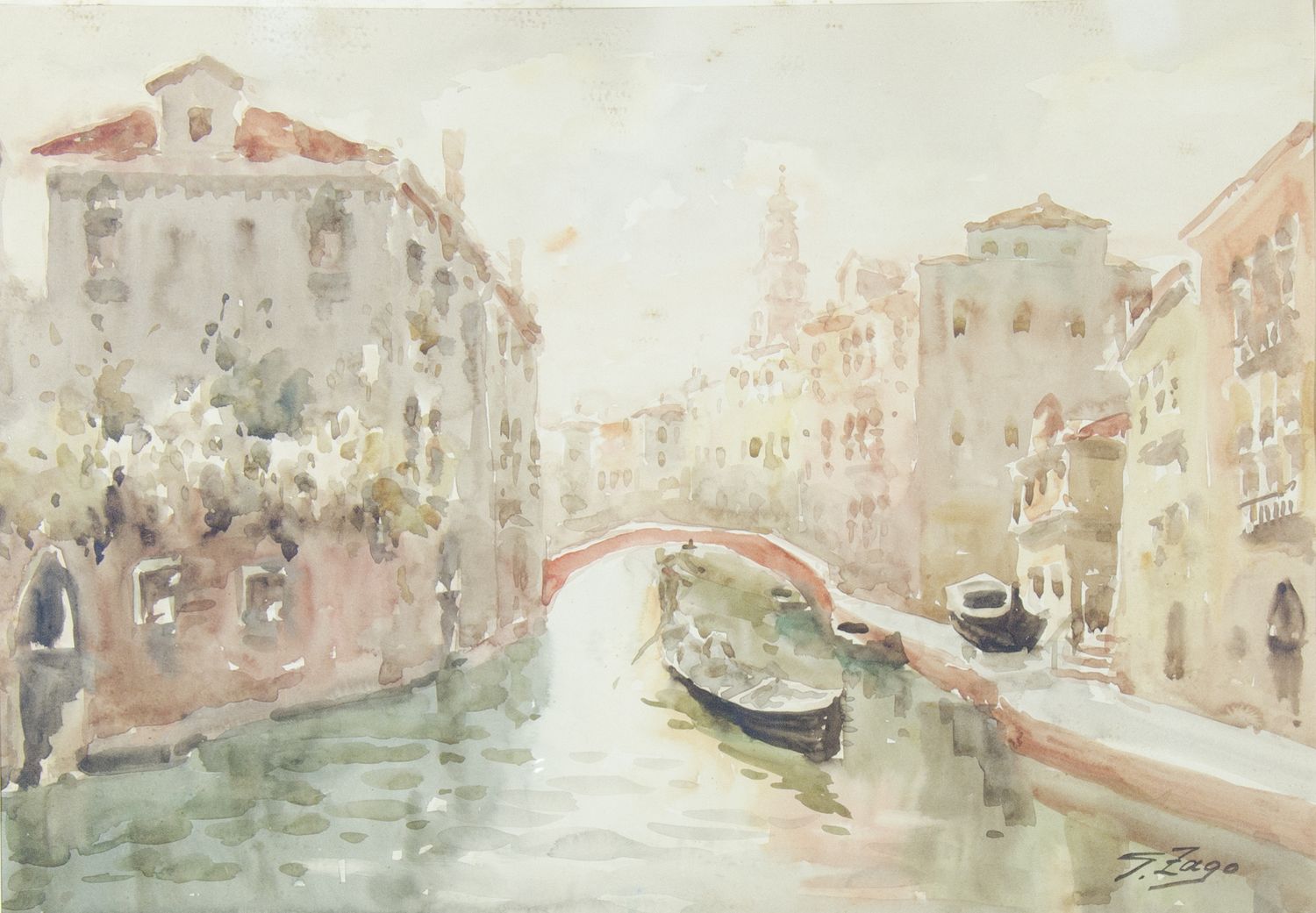 Giuseppe Zago 1881-1947 Lotto di 2 acquerelli, cm. 34x48: a) "Piazzetta a Venezia", firmato b. a d. Al retro etichetta Mostra personale dell'Artista, Galleria Bordin Padova 1948. b) "Canale veneziano", firmato b. a d. Al retro etichetta Mostra perso