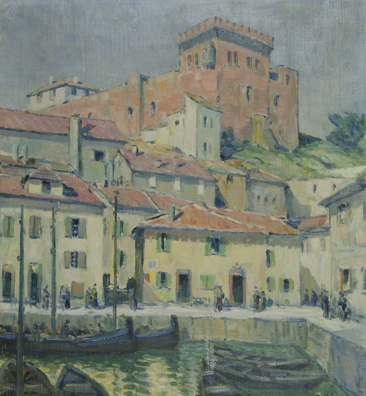 Rudolf Gonner Bad Nuestadt 1872-1926 "Il Mandracchio di Muggia e il Castello" cm. 66x60 - olio su tela Firmato b. a d. Al retro sul telaio: "N. 37 Kastel".