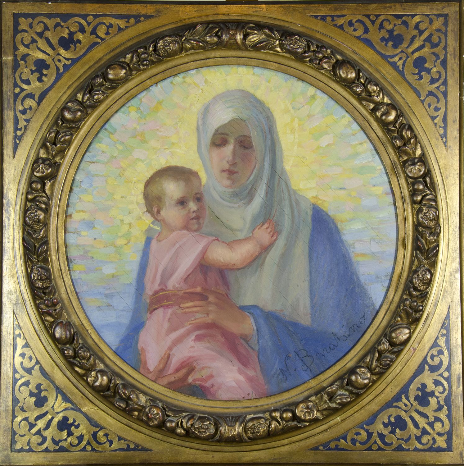 Nicolò Barabino 1832-1891 "Madonna con bambino" diam. cm. 50 - olio su tavola Firmato b. a d.