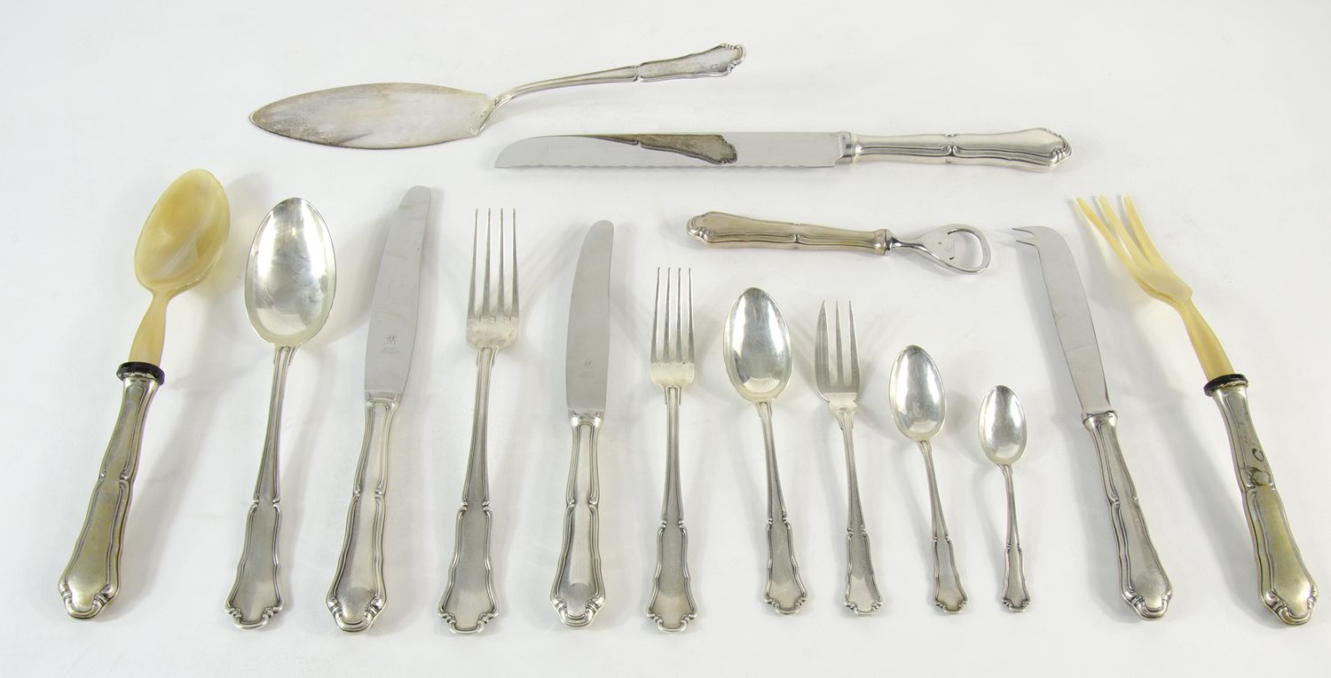 Servizio di posate in argento per 12 persone composto da 112 pezzi. (un...
