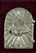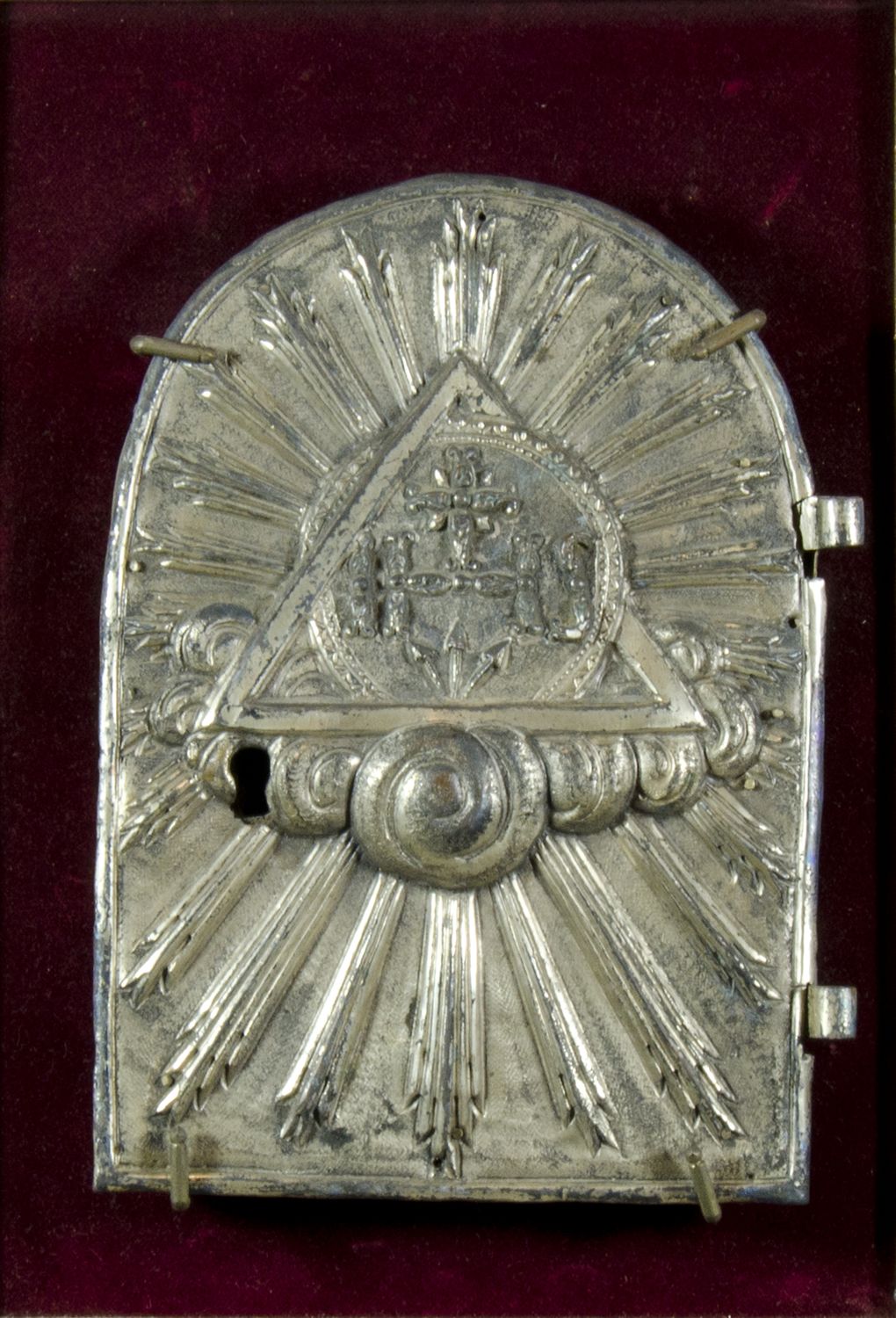 Portella di tabernacolo in metallo argentato lavorato a sbalzo con simboli religiosi. XVII secolo.