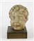 Testa di putto in pietra, su base in legno. H. tot cm. 22.