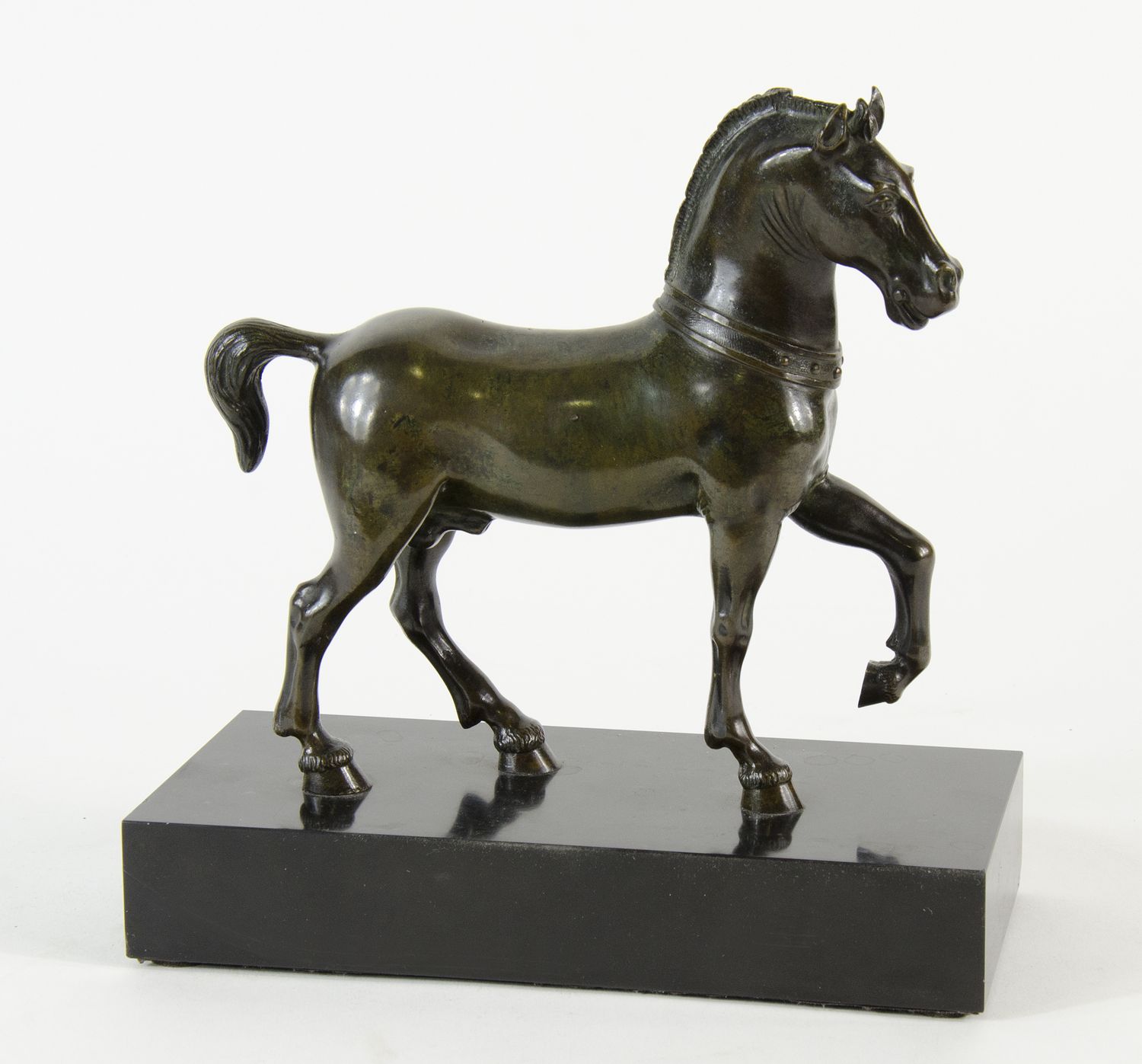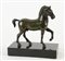 Scultura in bronzo a patina verde raffigurante cavallo, base in marmo. XIX secolo. Lung. tot cm. 23.