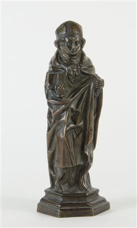 Scultura in bronzo a patina marrone raffigurante Vescovo. Germania, XVI secolo. H. cm. 26,5.