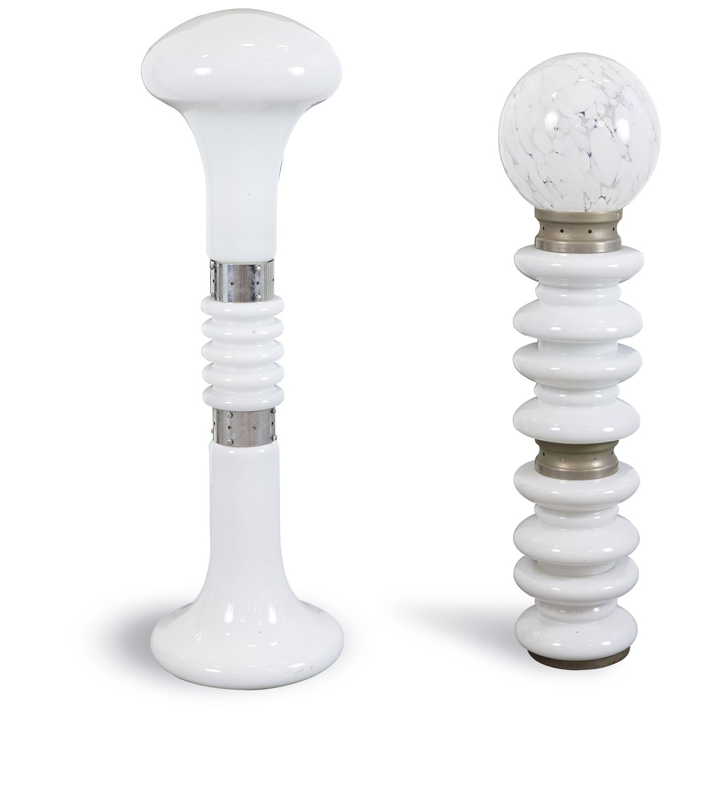 LAMPADE - Due lampade in vetro opalino, montatura in metallo cromato. 1970 circa. rispettivamente h cm 118 e 125