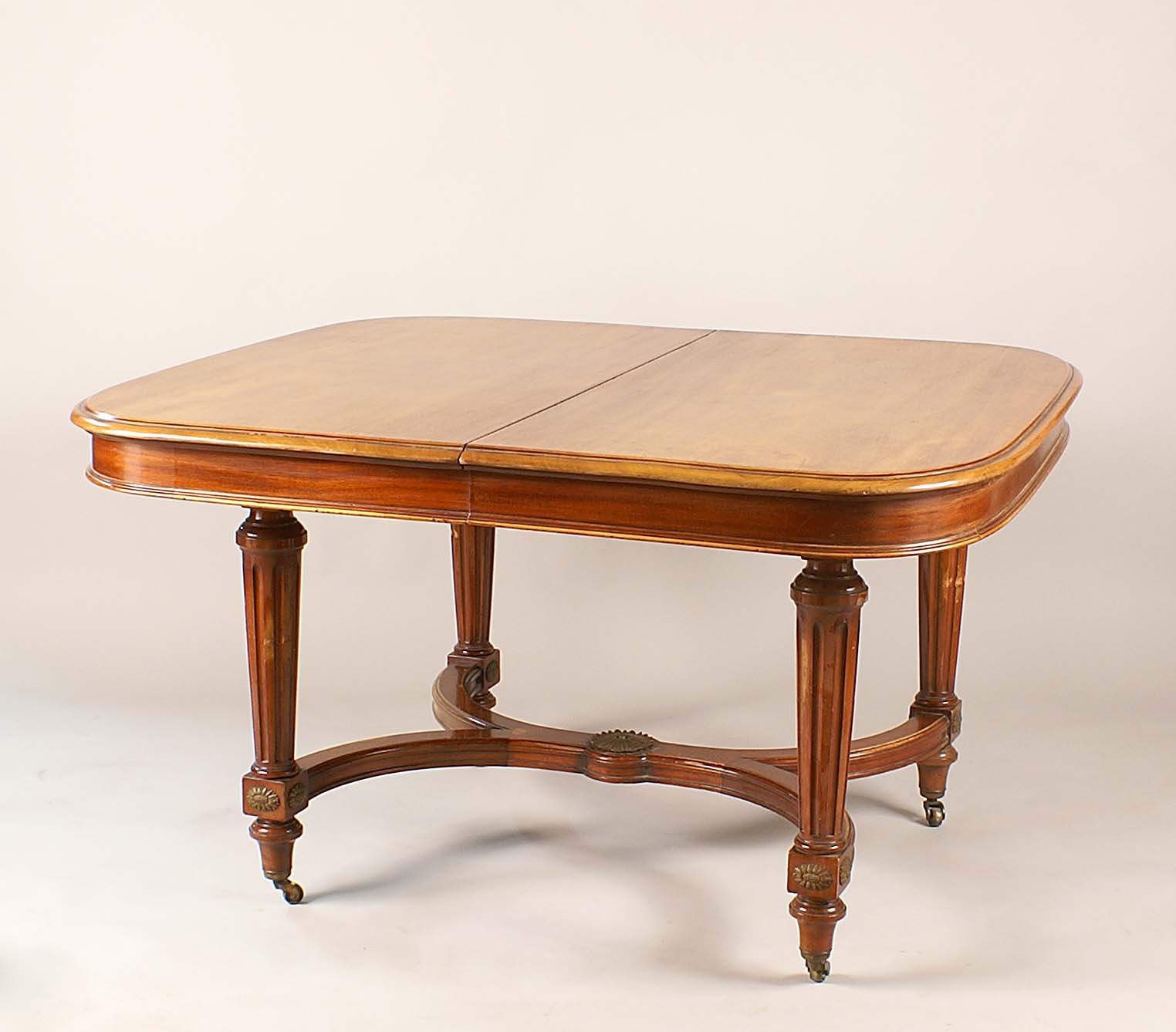 Tavolo allungabile in mogano con applicazioni in bronzo dorato, poggiante su quattro gambe scanalate, tornite e riunite a crociera, terminali provvisti di rotelle, Francia fine del XIX secolo, cm. 81x146x135, completo di tre prolunghe da cm. 50 cadauna.