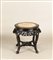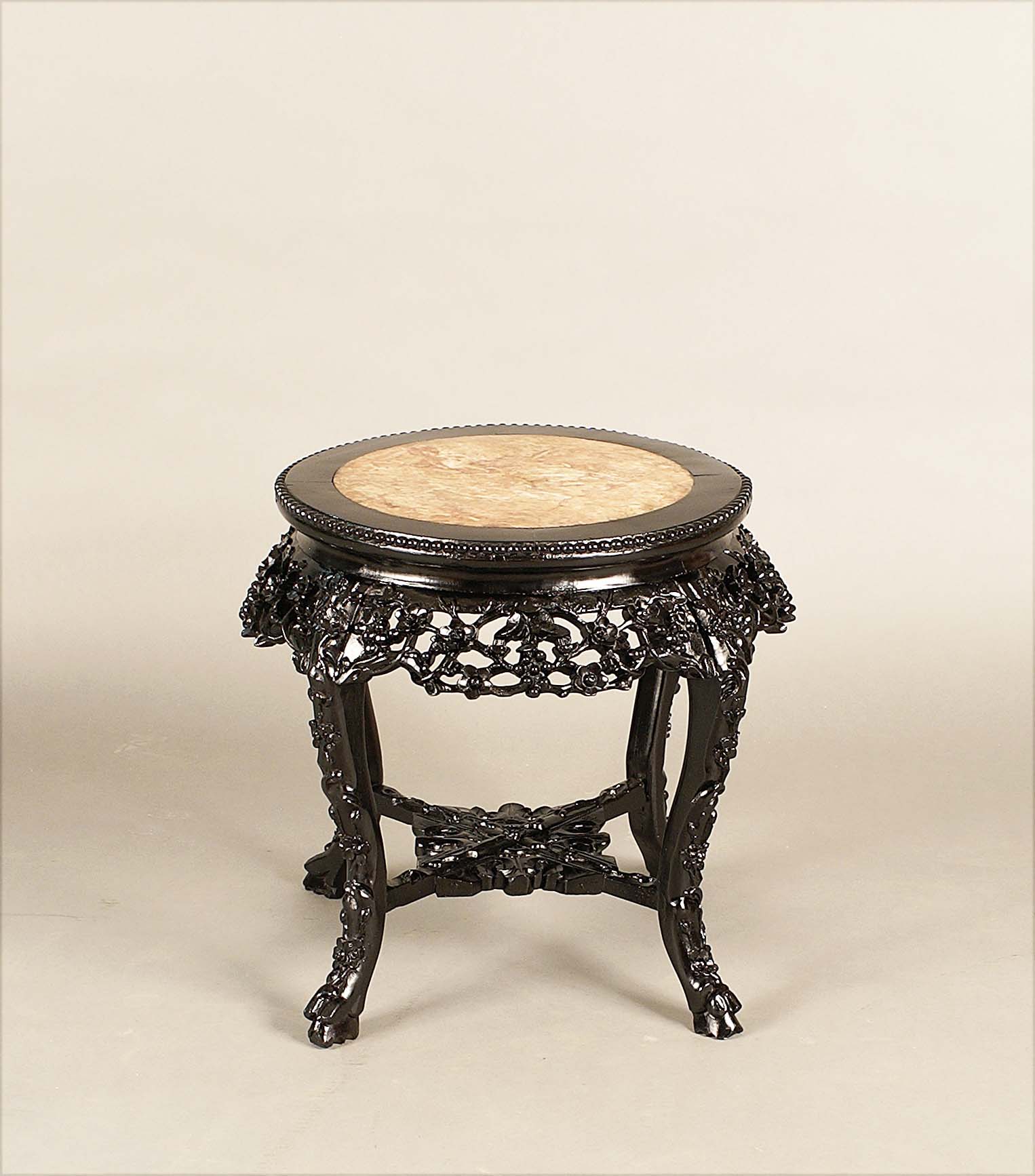 Tavolino basso in legno ebanizzato e scolpito, piano circolare in marmo, manifattura orientale, h. cm. 49, d. cm. 43.