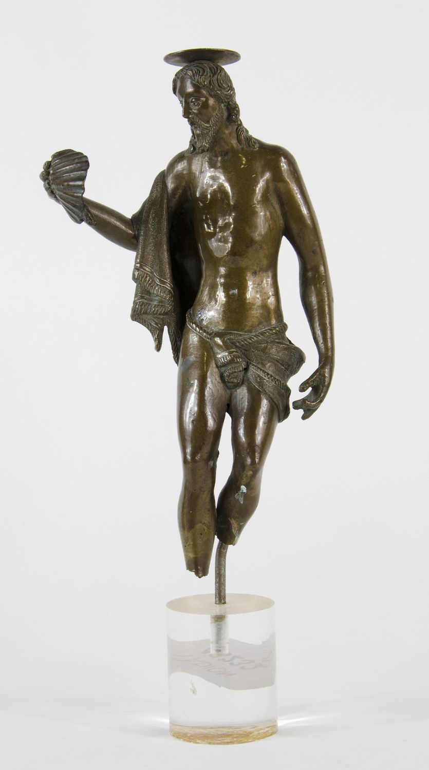 Scultura in bronzo a patina marrone raffgiurante Cristo. Veneto, XVII secolo. H. cm. 29,5. (mancanze).