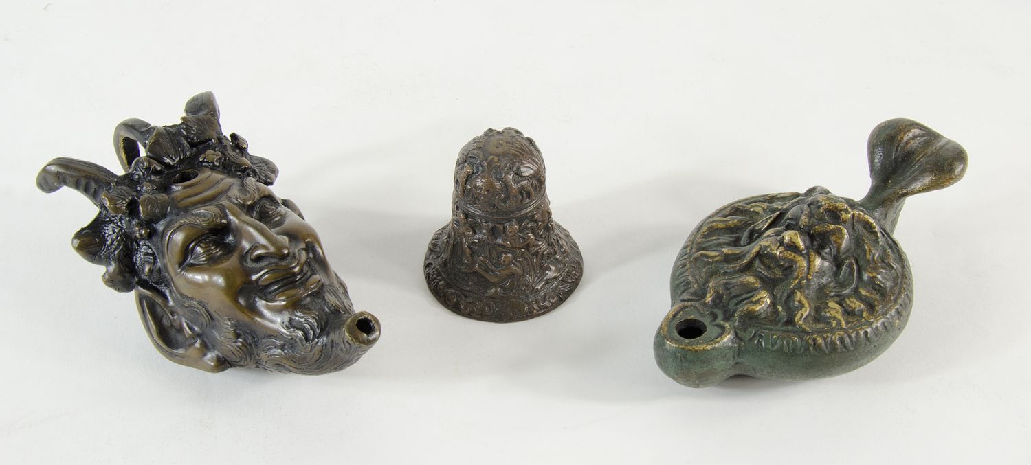 Lotto di 3 oggetti in bronzo tra cui campanellino e due lucerne scolpite. Epoche varie.