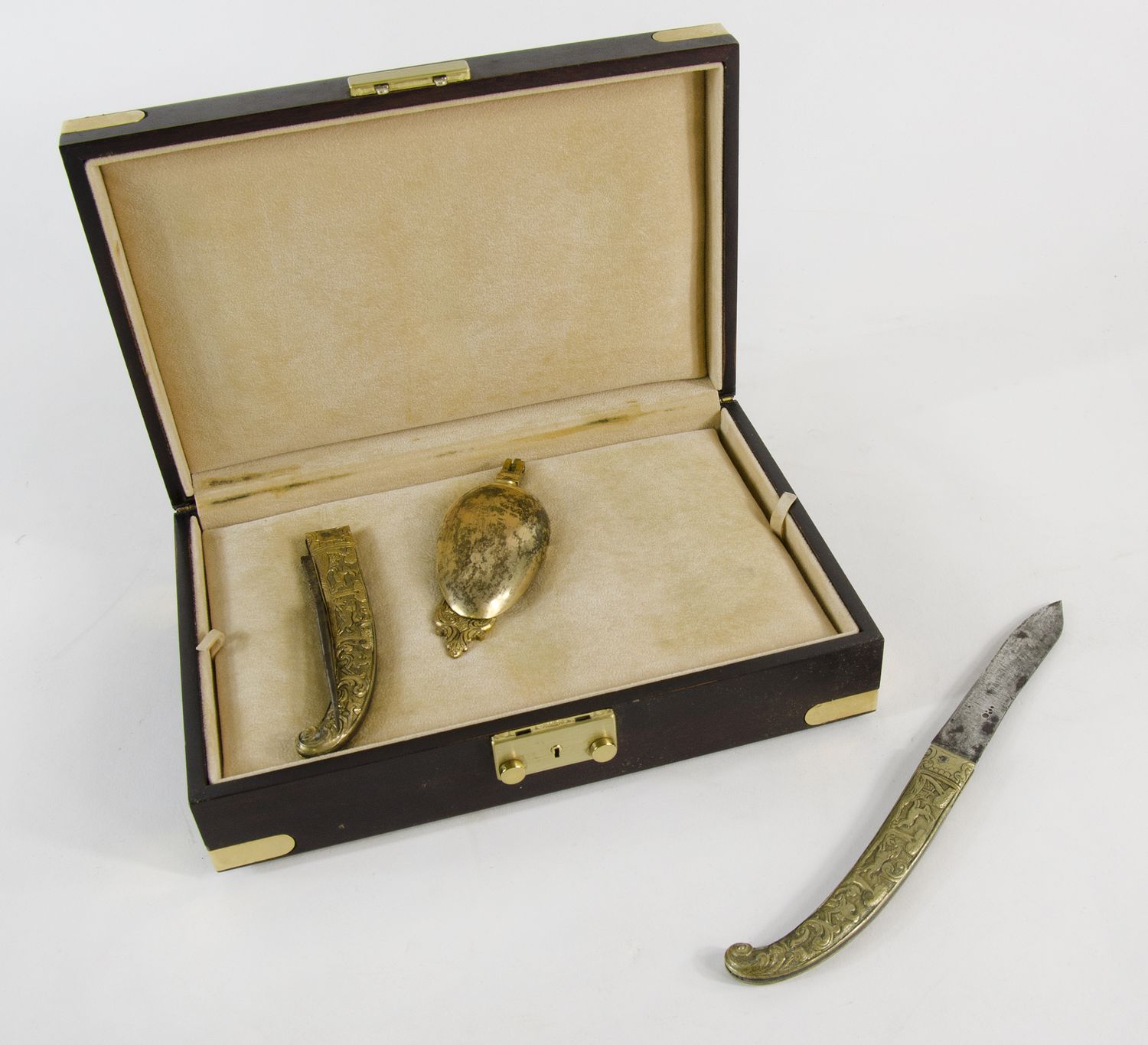 Set di 3 posate da viaggio in metallo dorato inciso decorate con scene di caccia. Germania, XVIII secolo.
