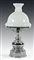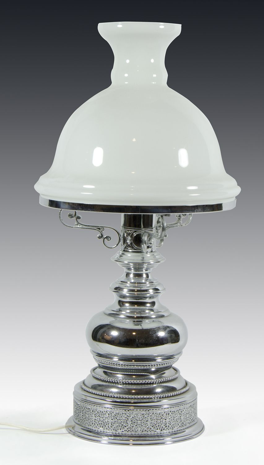 Lampada da tavolo in metallo cromato con paralume in vetro opalino. H. cm. 68.