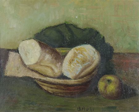 Gino Brogi 1902-1989 "Cesto e pane" cm. 40x50 - olio su tela Firmato b. a d. Al retro: titolo, firma e data 1968; Galleria Torbandena Trieste.