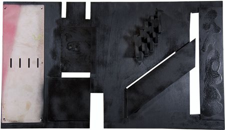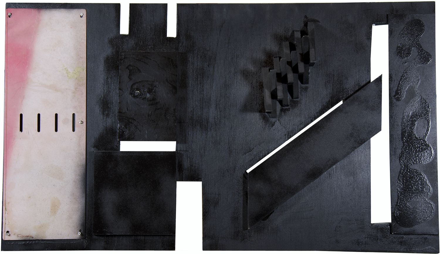 Stefano Soddu 1946 "Composizione A" (2015) cm. 100x55x15 - acrilici su legno Firma e titolo al retro. Autentica su fotografia.