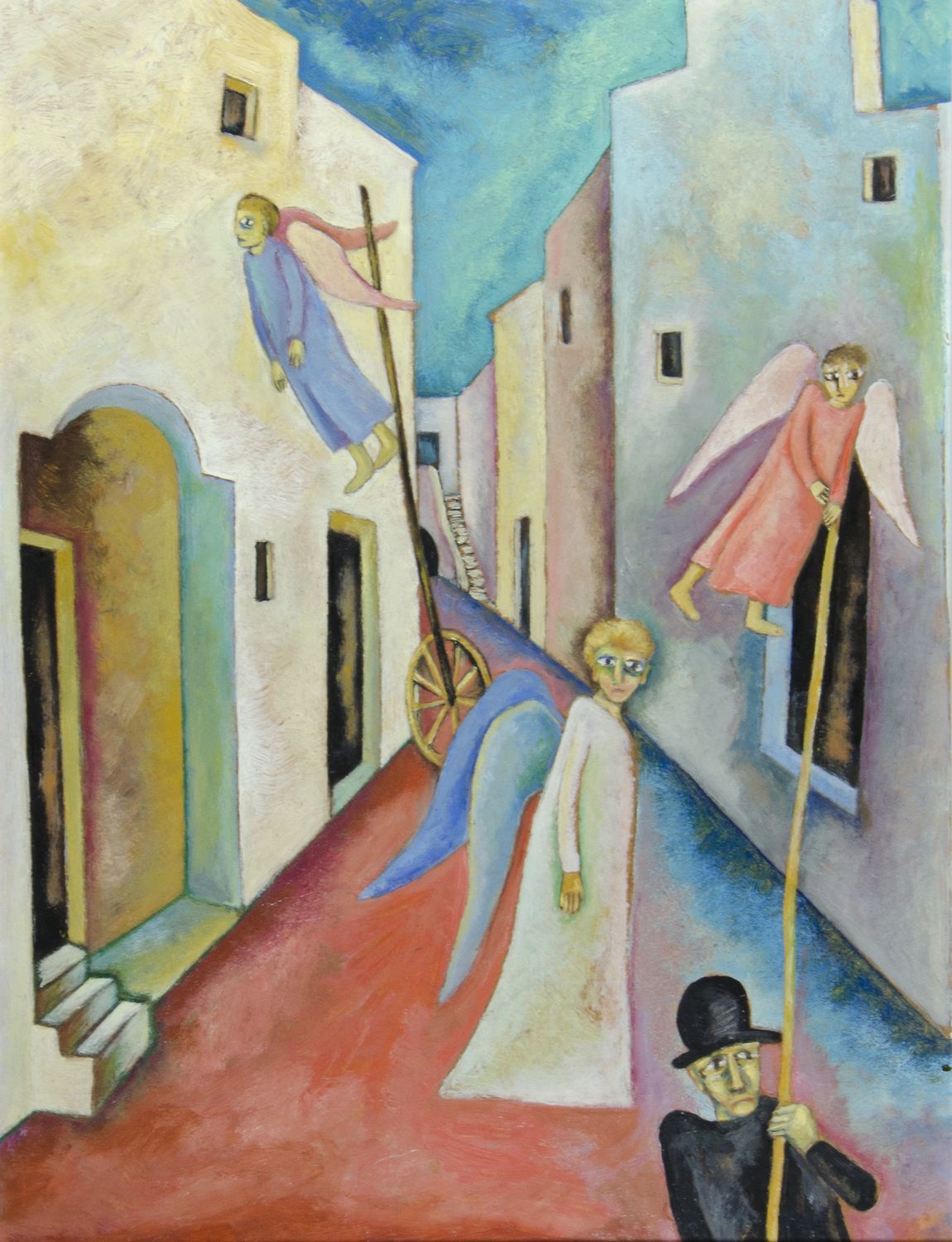 Elettra Metallinò Trieste 1932 "Angeli per le strade" cm. 58x45 - olio su faesite